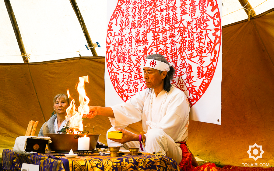 Kazuhisa Ogawa, practising Shugendo. In this ritual of purification of places and people, he embodies the dual path of the Japanese spiritual warrior: both Samurai, through the rigour and discipline of his movements, and Ninja, through his knowledge of energies and the invisible.