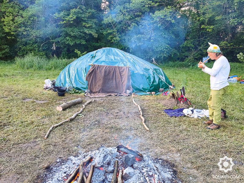 Marc Leblet, initiated into Celtic shamanism and wood craftsman. In front of the sweat lodge, he smokes one of his pipes. The smoke — from his creation and from the sacred fire — rises and aligns.