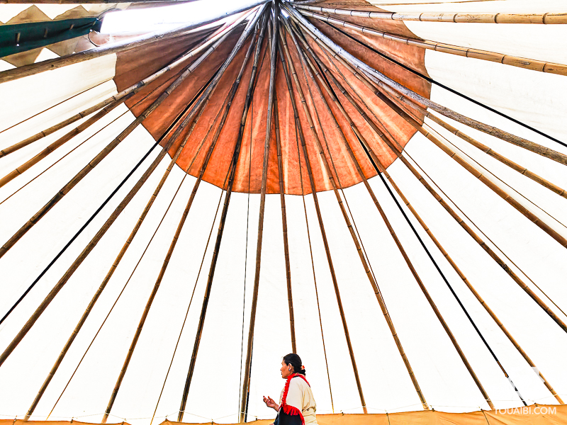 Cheryl Angel, recognised by her Lakota community as the bearer of the spirit of water. A discreet figure in front of the immense canvas of the Elders' Tipi, a space where she performs a ceremony for the balance of the planet.